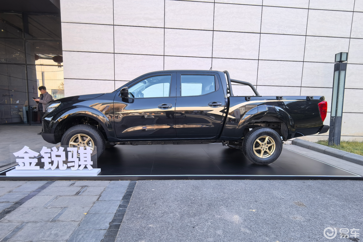 来到侧面,金锐骐仍然是高大威猛的皮卡造型,敦实的车身与硬朗的线条呈现出颇有张力的越野气息。同样,新车通过金色轮毂展现金锐骐的身份,带来了更明显的高级感。