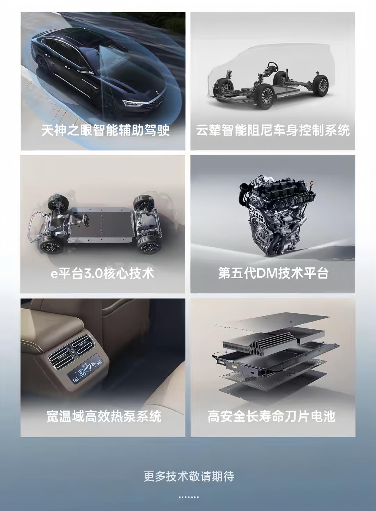 领汇e9基于比亚迪e平台3.0打造。官方表示,未来比亚迪多项技术将应用在领汇汽车产品上,包括天神之眼高级驾驶辅助系统、云辇智能车身控制系统,并整合第五代DM技术、宽温域高效热泵系统等资源。