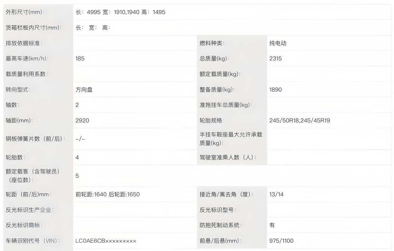 车身尺寸,长宽高分别为4995/1910(可选1940)/1495mm,轴距2920mm,采用4门5座布局,属于中大型纯电轿车,空间表现符合营运场景的载客、载物需求,符合网约车与出租车辆合规标准。