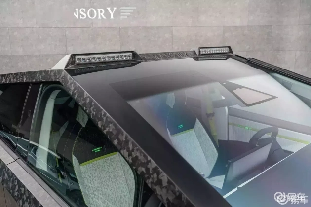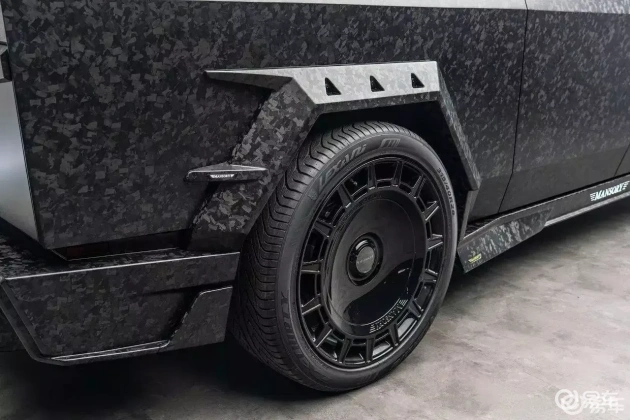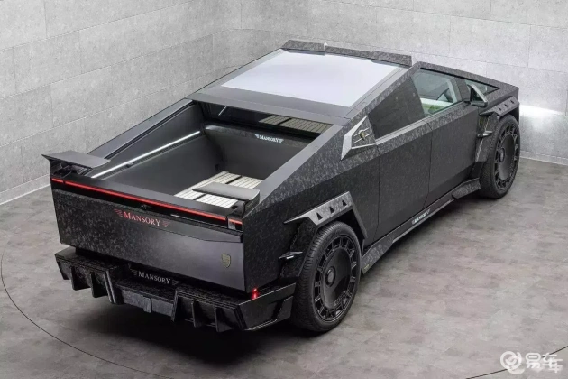 这辆改装车几乎全身披覆由锻造碳纤维制成的套件,从车头到车尾,甚至连车窗周围和车斗侧边也覆盖着极具视觉冲击力的碳纤维纹理。这一改动瞬间提升了原车不锈钢板的冷硬质感,使其显得更加科幻和奢华。