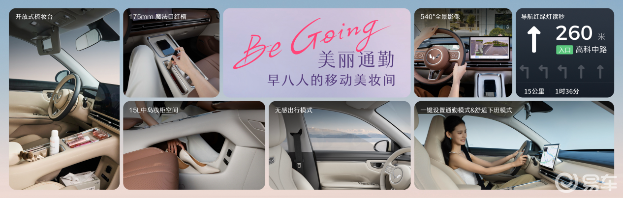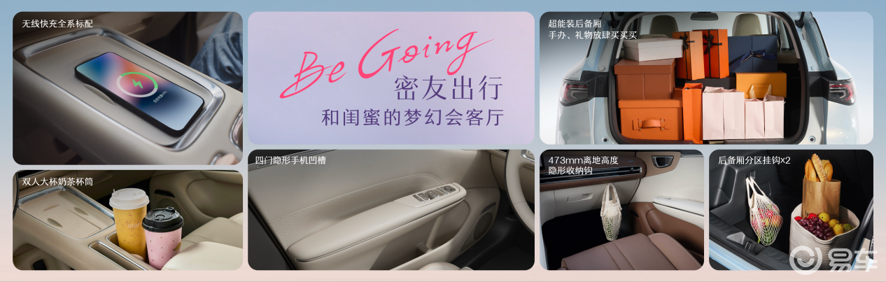 “密友”出行模式下,它不再是简单的交通工具,更是你们感情的“扩容器”,前排配备双人奶茶杯筒,深浅搭配奶茶杯“不打架”,人手一杯“快乐水”;前排隐形手机凹槽、多处收纳挂钩等细节配置,手机、外卖袋等小物件都有容身之所;50W无线手机快充,彻底告别手机电量焦虑,还有贴心的开放式补妆梳妆台、175mm专属口红槽、化妆镜LED补光灯等,用舒适和乐趣装下所有欢声笑语,待在车内都让每一次结伴出行都成为美好回忆。