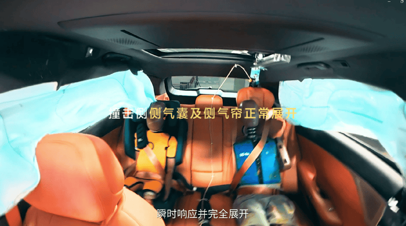 其次是对乘员的保护,当发生碰撞时,东风风神L8标配的主副驾驶席安全气囊、主副驾驶侧安全气囊以及前后排侧气囊都能瞬时响应,并且顺利打开,将前后排假人稳稳承接住,再加上安全带及时预紧,最终所有假人的各项伤害值均远低于标准限值,证明能对乘员起到关键的保护作用。