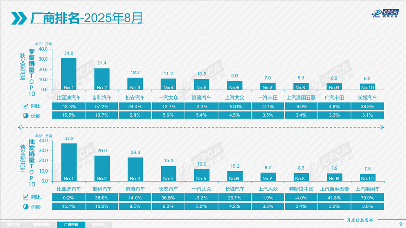 8月新能源乘用车企业总体走势较强,比亚迪纯电动与插混双驱动夯实自主品牌新能源领先地位;以比亚迪汽车、吉利汽车、奇瑞汽车等为代表的狭义插混表现持续强劲。