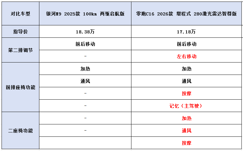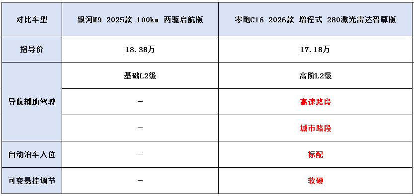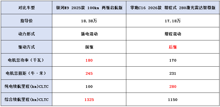 为了更直观的对比,咱们挑选两款价格相近的车型进行对比,售价18.38万的银河M9 2025款 100km 两驱启航版,和售价17.18万的零跑C16 2026款 增程式 280激光雷达智尊版相比,银河M9的CLTC纯电续航仅100公里,但零跑C16的纯电续航达280公里,也就是说如果你提倡通勤距离在50公里左右,银河M9需要2天充一次电,零跑C16则可以做到5天充一次。当然两款车都是混动车型,不会有续航焦虑,不过谁不想平时用电多省点钱呢,油就留着跑长途的时候用。