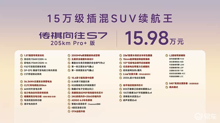 本次上市的两款传祺向往S7 Pro+版,与定位全系入门的115km Pro版相比,核心产品差异集中在电池容量与续航里程两大核心维度。配置层面,这两款Pro+版在保留基础功能的同时有所调整:一方面新增了隐藏式主动进气格栅与底盘护甲,提升了实用性;另一方面则相比115km Pro版减少了主驾座椅4向腰托、副驾座椅老板键、第二排侧面安全气囊及双腔远端安全气囊。