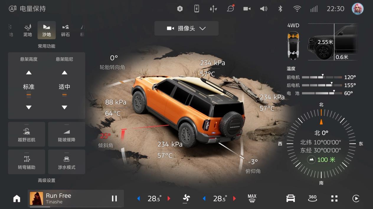 在传承福特烈马家族越野基因的同时,智趣烈马全系标配高性能四驱系统及前、后机械式差速锁,具备出色的牵引力与复杂路况通过性。针对越野新手,车辆搭载“越野360系统”,实时监测车辆姿态并同屏显示关键参数,对潜在风险进行预警,提升操控信心与安全。