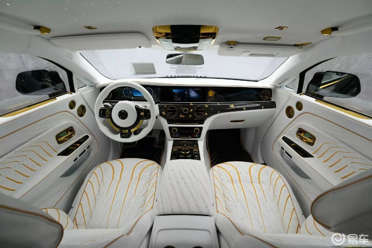 如果说外观的改动是“土豪式炫富”,那内饰的升级就是“把奢华焊在骨子里”。Mansory的设计师用顶级白色真皮包裹了整个座舱,座椅的缝线、滚边全部采用金色,与外观的镀金元素完美呼应;车门板、中控台、变速箱通道等位置,大面积嵌入锻造碳纤饰板,金色饰条穿插其间,营造出一种“未来科技+古典奢华”的混搭氛围。