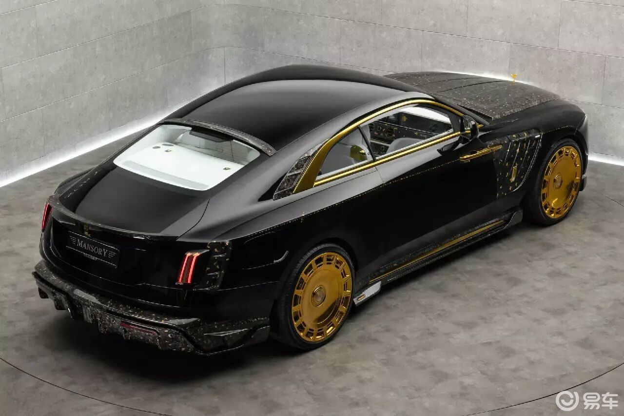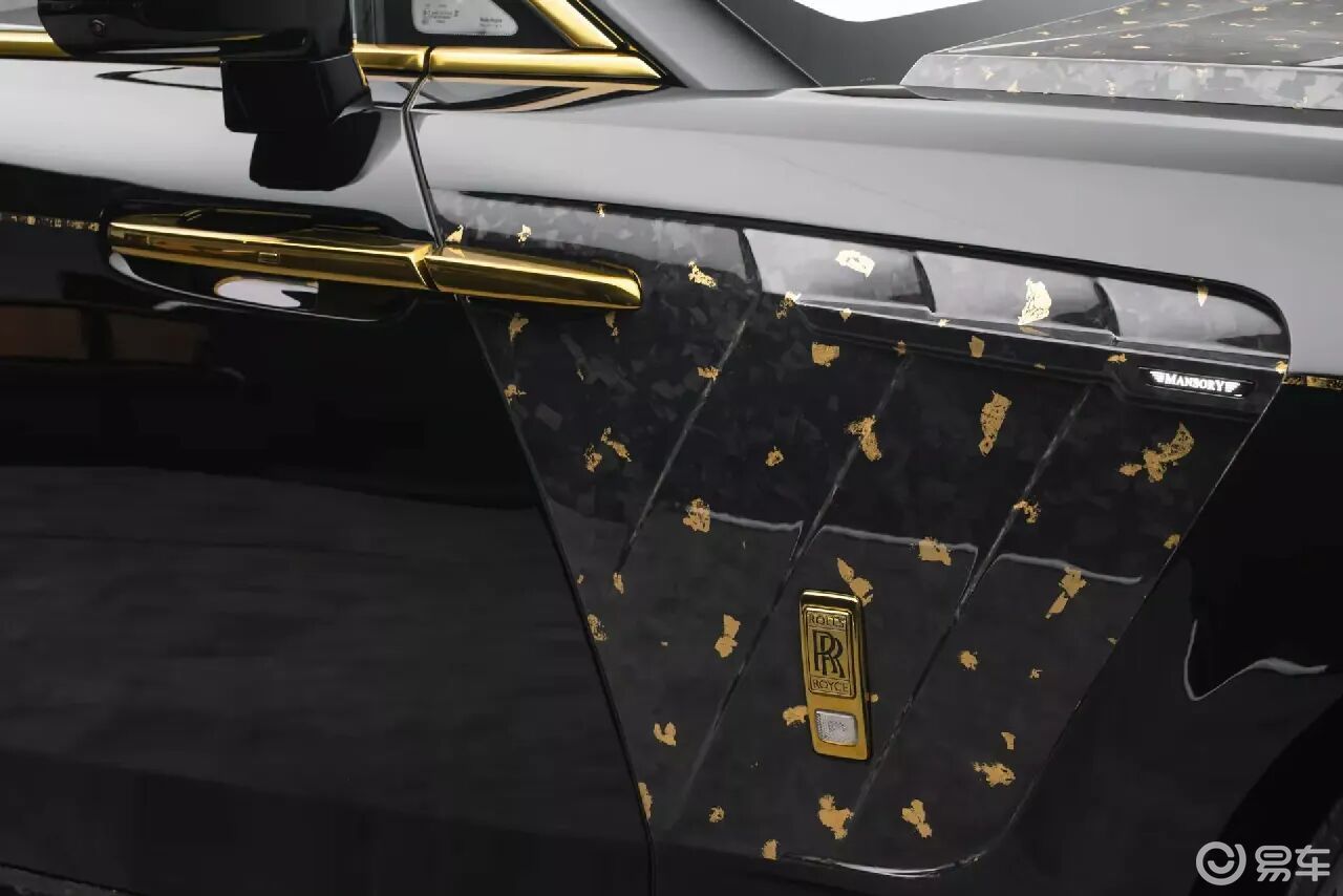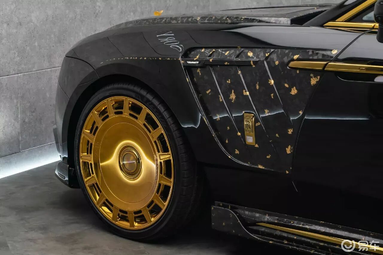车身侧面的改动同样夸张。前后翼子板被加宽,嵌入了大面积的锻造碳纤饰板,搭配定制的24英寸镀金轮毂,直接把气场拉满;车门把手、车窗边框、侧裙等细节处,全部点缀镀金元素,就连贯穿车身的腰线,都换成了碳纤与镀金拼接的样式。